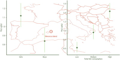 Mercury levels measured in 302 hair samples of 4 year-old children from Menorca (western Mediterranean Sea) are reported. Their concentrations, arithmetic mean 1.4 μg/g, ranging between 0.040 μg/g and 10 μg/g, were higher than in other children inland populations but lower than in previously studied island cohorts, e.g. Faroe, Madeira and Seychelles. 20% of the samples were above the WHO recommended values. Higher concentrations in females than males were observed. Frequent consumption of fish and other seafood were significantly related to the observed mercury concentrations. Oily fish was the main source of this pollutant but shellfish and squid consumption were also associated with high mercury concentrations. Maternal smoking, occupational status or previous siblings were also found to significantly influence the levels of this pollutant. McCarthy Scales of Children’s Abilities used to assess children’s motor and cognitive abilities did not show association with mercury concentrations at 4 years of age.