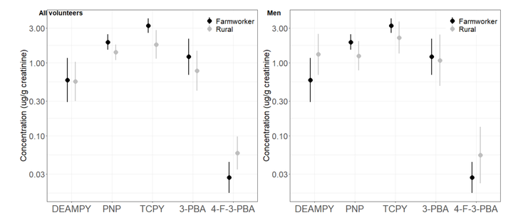 Organophosphate (OP) and pyrethroid pesticides (PYR) are extensively used in agriculture, resulting in higher exposures among farmworkers. The present study reports the occurrence of 8 urinary OP and PYR metabolites in a sample of farmworkers and residents from Sucs (n = 87), a rural township in North West Catalonia (Spain). The aim of the present study was to examine differences in urinary pesticide metabolite concentrations between occupationally-exposed (farmworkers; n = 45) and environmentally-exposed subjects (n = 42) and to assess the relationship between pesticide’s exposures and occupational activities in a real-case scenario. Six OP and two PYR metabolites have been investigated, urine samples were extracted using SPE extraction and analyzed by UPLC-MS/MS. Three OP metabolites were commonly detectable in urine, namely TCPY (metabolite of chlorpyrifos), PNP (parathion) and DEAMPY (pirimiphos). Regarding pyrethroids, the two analyzed metabolites, 3-PBA and 4F-3-PBA, were detected in a high proportion of urine samples. Differences in concentrations between both groups were statistically significant for TCPY and 4F-3-PBA (Mann-Whitney U Test for independent groups, p < 0.05). In the case of TCPY, the concentrations were higher among the farmworkers, which is consistent with their occupational activity. The small differences found in DEAMPY, PNP, 3-PBA or even the significant higher concentrations of 4F-3-PBA among rural population suggest a general exposure to these compounds, even in those who do not carry an occupational activity. Specific personal protective equipment (PPE) among farmworkers, such as the use of gloves and mask during mixing, showed a decrease in the exposure levels, although the differences were not statistically significant. However, a positive association was found between the use of a cap during mixing (for PNP and 3-PBA) and during application (only for 3-PBA). However, this piece of cloth is mainly used for sun protection, and when not cleaned after the handling of pesticides, it might represent a continuous source of exposure through dermal contact. Farmworkers using tractors with cabin had statistically significant lower concentrations of DEAMPY than those using a tractor without cabin. The previous results suggest that occupational protections should be encouraged among farmworkers and other potential workers handling with pesticides.