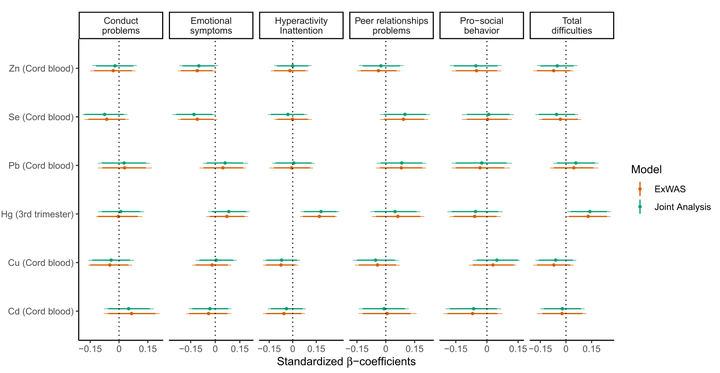 Metals and micronutrients concentrations were measured in cord blood (Pb, Cd, Se, Zn, Cu) and in maternal hair (Hg) collected during the 3rd trimester of pregnancy. Behavioral and emotional problems, as well as children’s cognitive and psychomotor development, were assessed in 436 school-age children using the Strengths and Difficulties Questionnaire (SDQ, filled in by the mothers) and the Polish adaptation of the Intelligence and Development Scales (IDS, administered by trained psychologists). Multivariate regression models were applied after imputation of missing values, using two approaches: (i) a joint analysis taking into account all metals and micronutrients simultaneously, and (ii) an ExWAS study (single-exposure model).