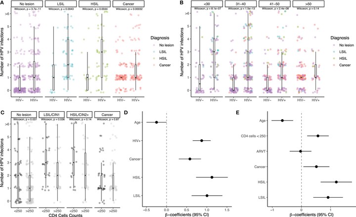 Methods: A total of 2,134 HIV+ and HIV− women from South-West Tanzania were prospectively screened for cervical cancer and precancerous lesions. Women with cervical cancer (n=236), high- and low-grade squamous intraepithelial lesions (HSIL: n=68, LSIL: n=74), and without lesion (n=426) underwent high-resolution HPV genotyping.